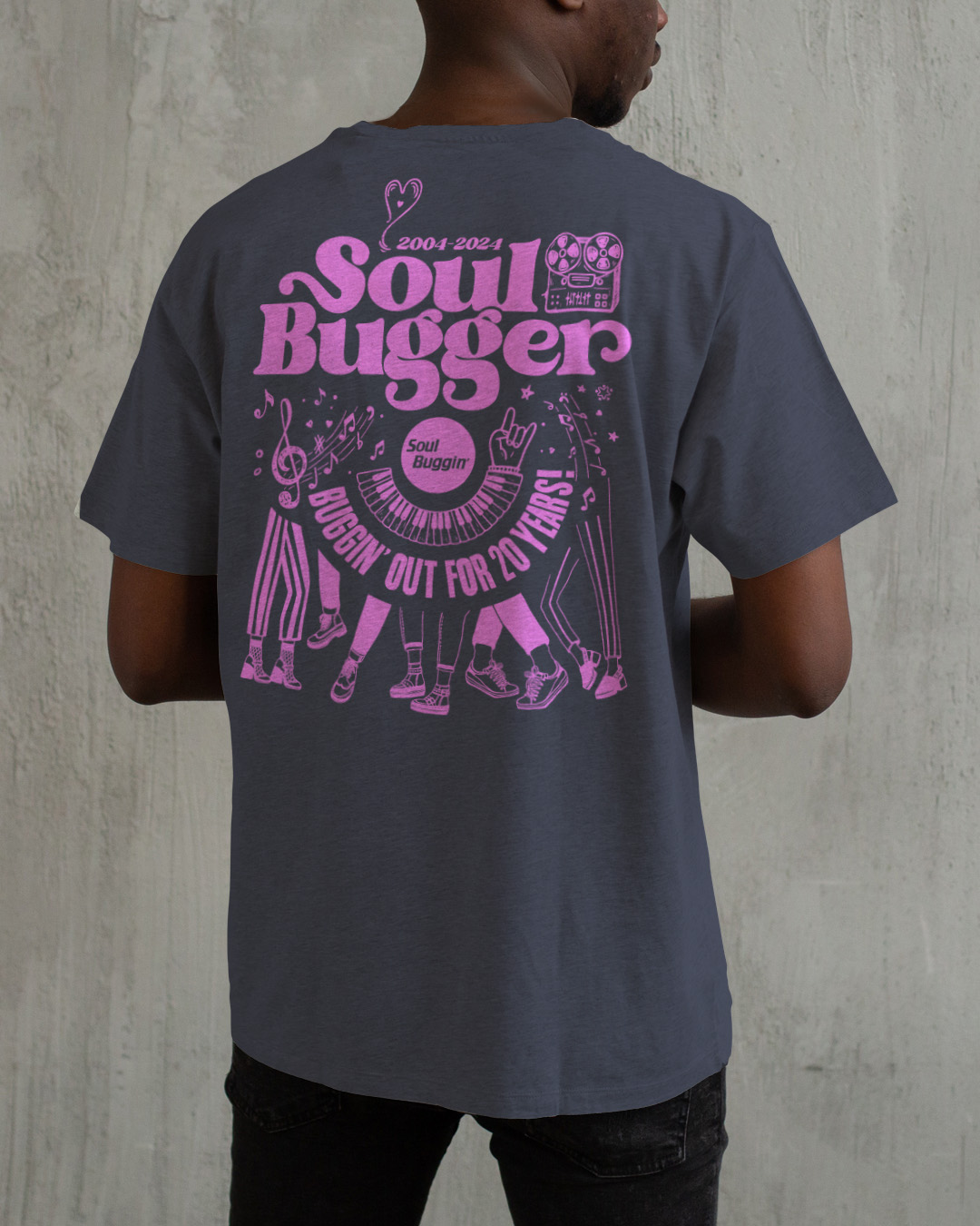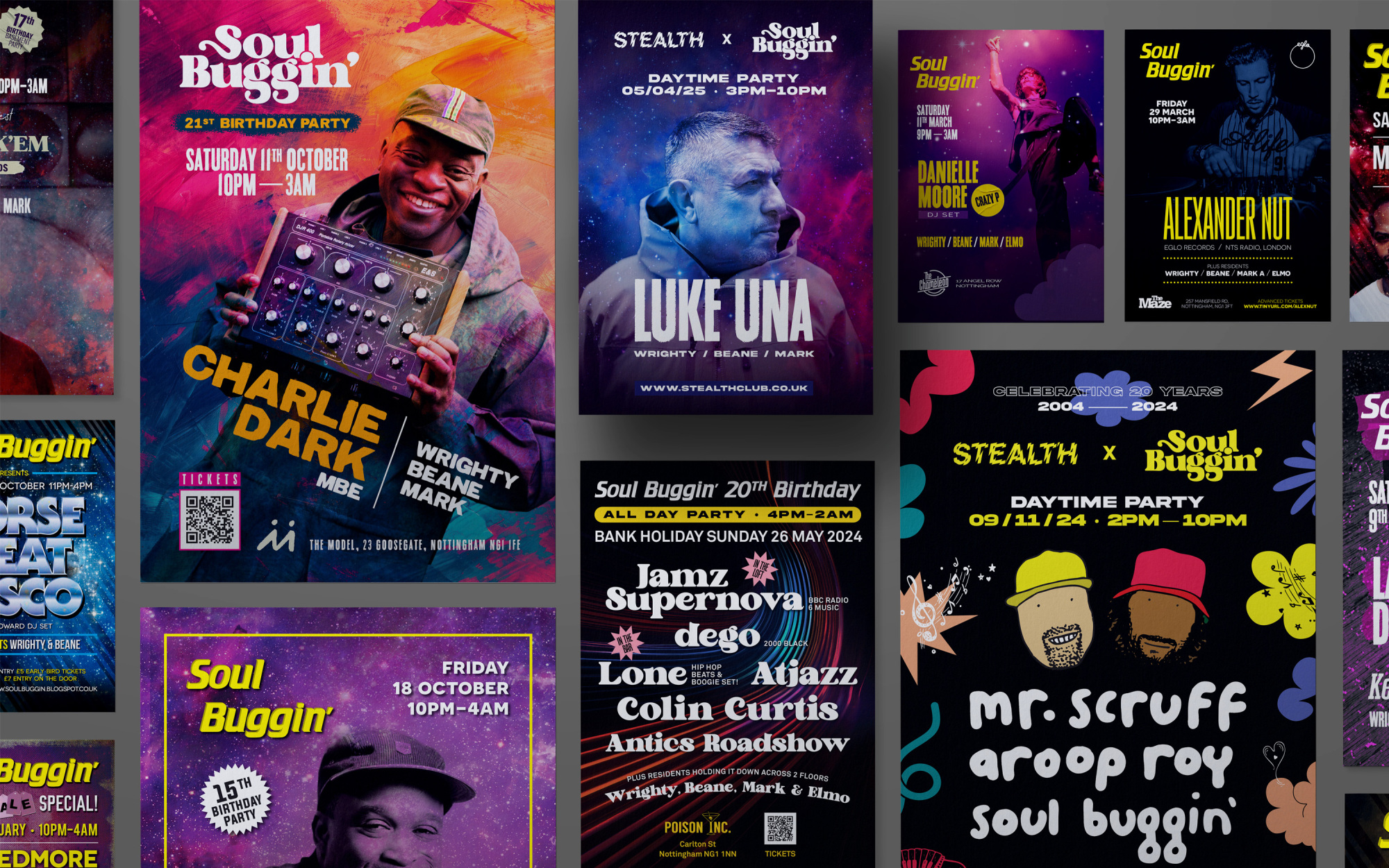 Soul Buggin' is a Nottingham club night that I co-run and is now in its 20th year. It's a real passion project that has seen thousands of people attend our events over the years. I produce all the marketing for the night that includes printed flyers, posters, clothing to online graphics and social media promotions/animations.